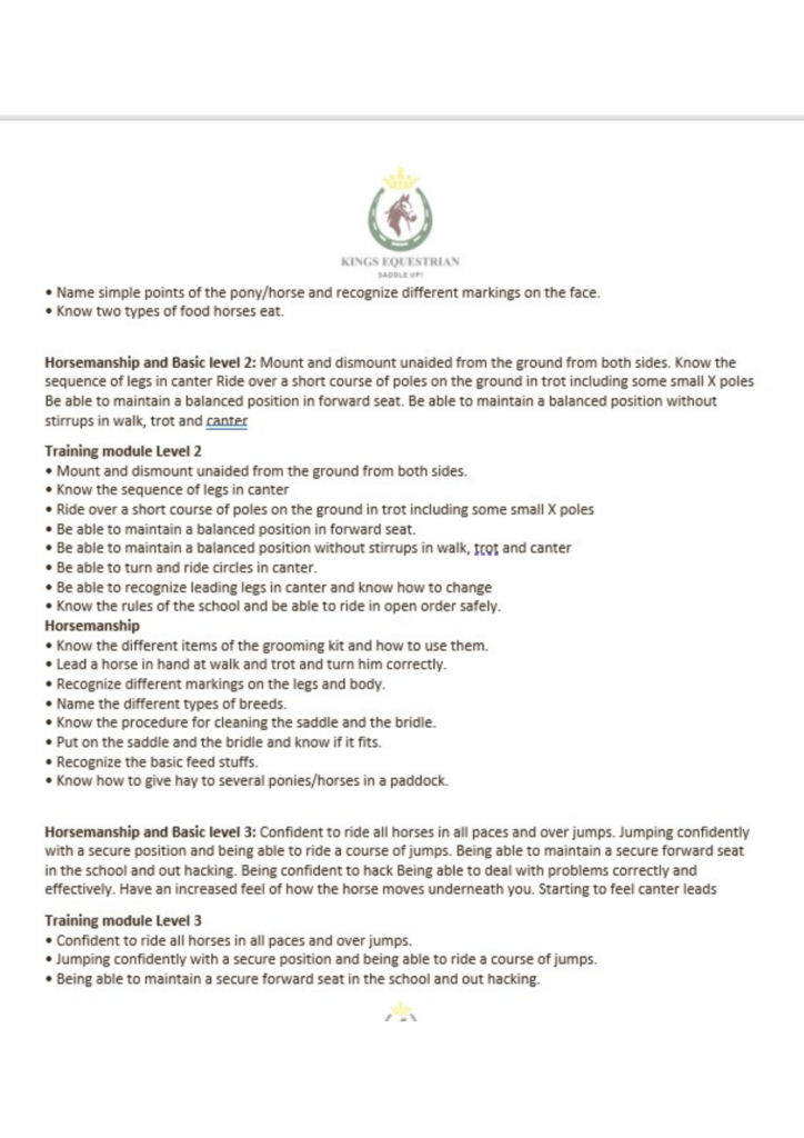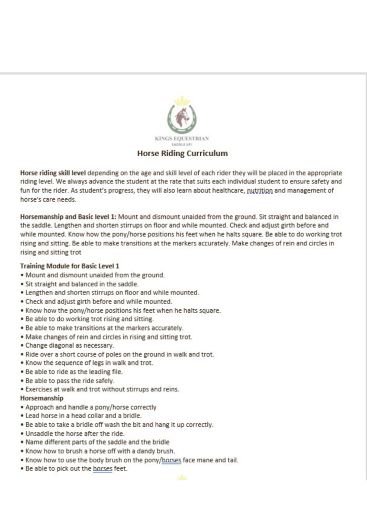 Kings Equestrian foundation approach for Education includes importance of curriculum development, lesson plans, capturing training progress, periodical assessment, and a structured approach in equestrian sports for kids and sportsman development is well-articulated. Here’s a summary of the key points: