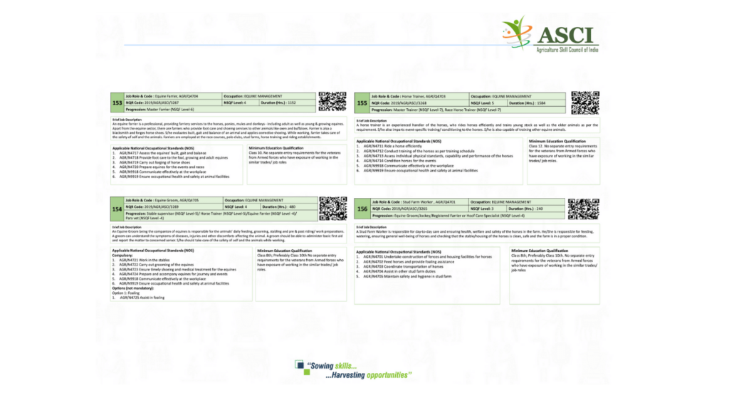 Assistant Equine Breeder helps the equine breeder in carrying out equine breeding operations. S/he should possess basic knowledge of equine genetics and be well versed with equine breeds, breeding norms and suitability of equines for various purposes and employment. Assistant equine breeder oversees covering of animals, monitoring of pregnancy, attending to foaling, and documenting history. S/he also assists in planning nutrition, inoculation and deworming for each category of animals. An assistant equine breeder should also possess managerial skills in executing breeding, rearing of breeding stock and associated functions at the stud farm.
